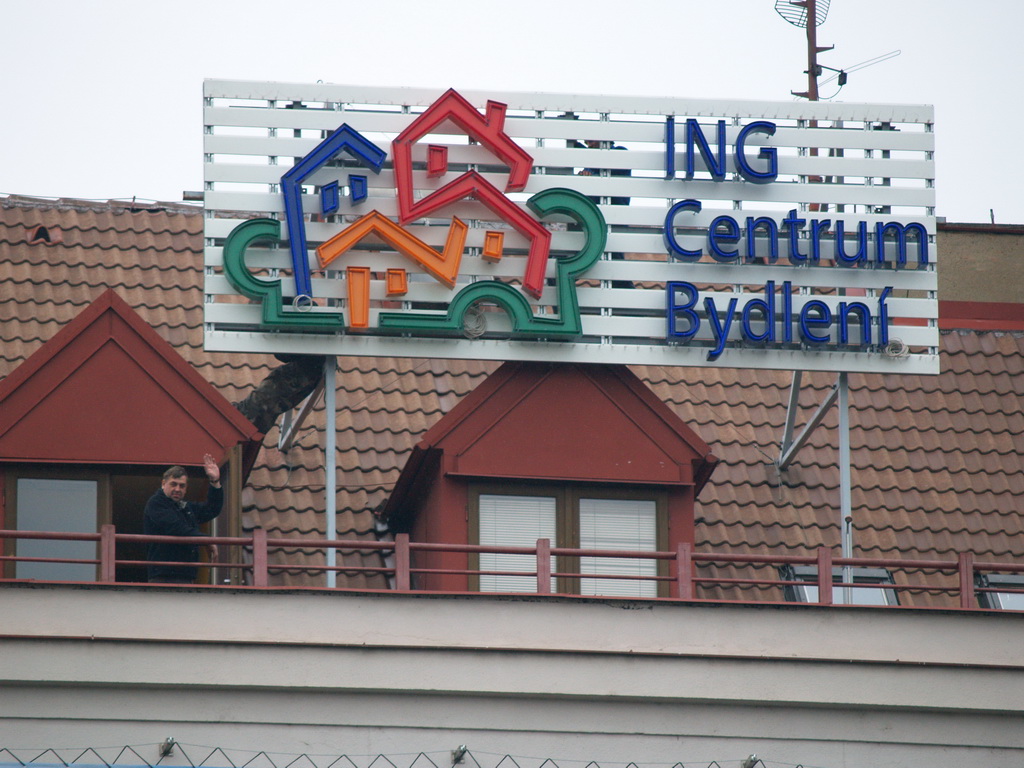 Ukázka instalace neonového loga společnosti ING Centrum bydlení na střechu budovy.